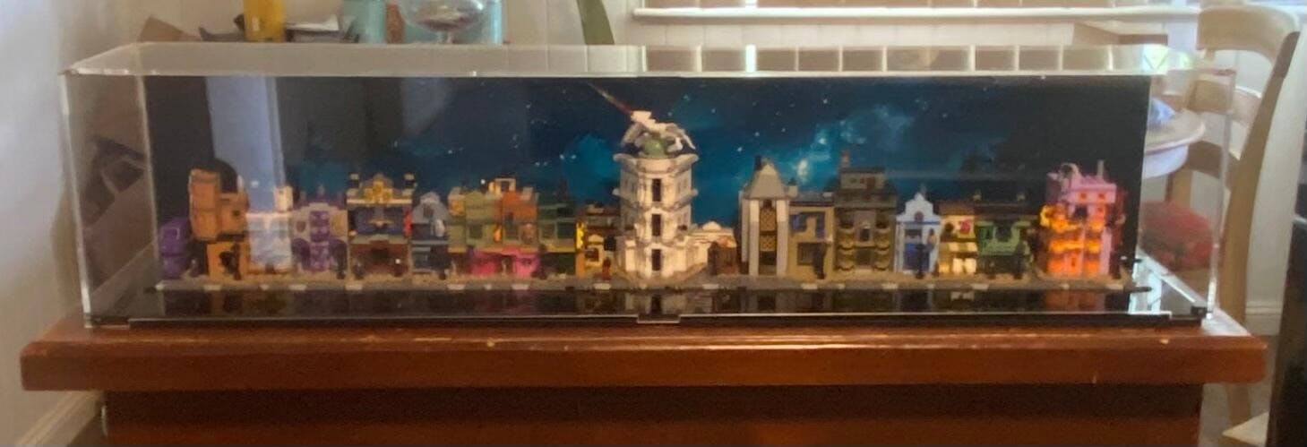 Keywords: Premium LEGO display case, crystal clear acrylic, UV protective acrylic, made in Australia, background design, Harry Potter, Diagon Alley.